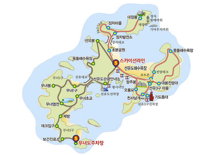 - A 코스 : 명사십리 해수욕장 → 명사십리 → 선유도대형버스주차장 → 장자대교 → 낙조대 → 장자도포구 → 대장교 → 대장도(장자할매바위)