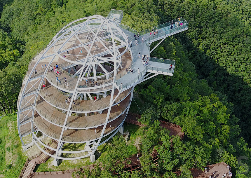 절벽 위에서 80∼90m 아래의 남한강 줄기를 내려보며 하늘 길을 걷는 스릴을 맛볼 수 있는 스카이워크로 멀리 소백산 연화봉을 볼 수 있습니다. 말굽형의 만학천봉 전망대에 세 손가락 형태의 길이 15m, 폭 2m의 전망대에 서면 발밑에 흐르는 남한강을 내려다보며 절벽 끝에서 걷는 아찔함과 짜릿함을 경험할 수 있는 곳입니다.
