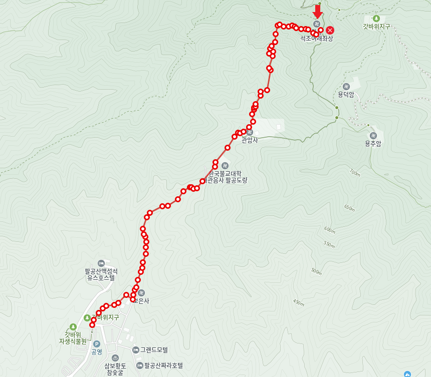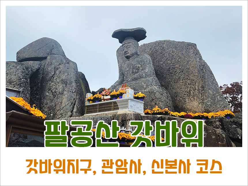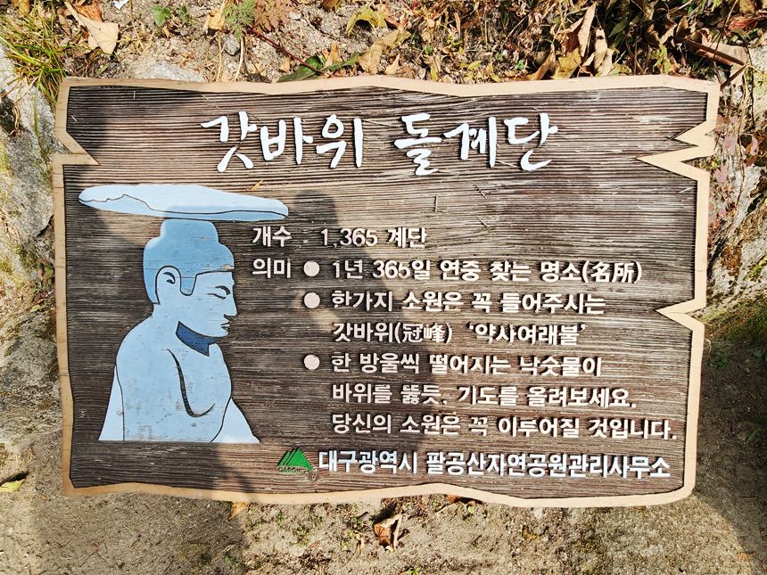 - 코스 : 갓바위 지구 > 관암사 > 돌계단길 > 관봉(팔공산 갓바위) > 용덕사 > 관암사 > 주차장 복귀