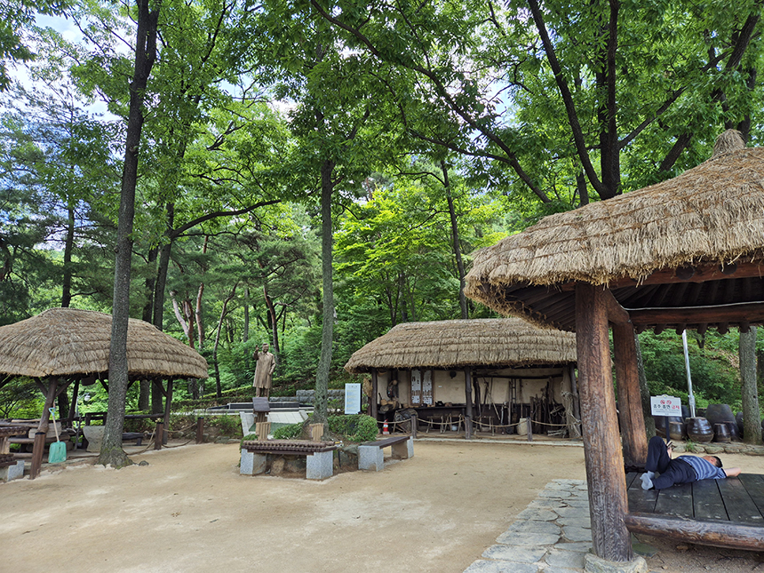 화합의 길이 만나는 지점의 노무현 대통령 동상을 지나 김대중 대통령의 동상이 있는 초가정에 이릅니다. 이 초가정은 김대중 대통령 생가에서 가져온 농기구 등을 전시한 곳으로 김 대통령이 정자에 앉아 사색을 즐기셨다고 합니다.