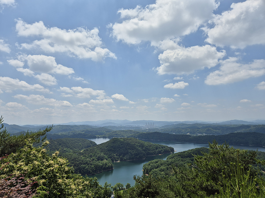 숲 속 능선길 도중에 골짜기를 넘어 연결해 놓은 출렁다리를 지나 제1전망대에 도착했어요. 봉황탑에서 보았던 것처럼 내륙의 다도해라 불리는 대청호의 푸른 녹음 물결이 시원하게 탁 트여 펼쳐집니다.