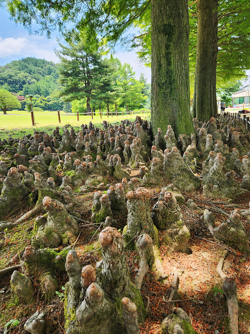 길게 뻗은 민주화의 길에 메타세쿼이아 아래엔 울퉁불퉁 기이한 모양의 뿌리가 마치 종유석처럼 자라고 있네요. 이게 낙우송의 뿌리인 "기근"이라는 것인데 습지나 토양이 불량하면 숨쉬기 위해 솟아난다고 합니다.