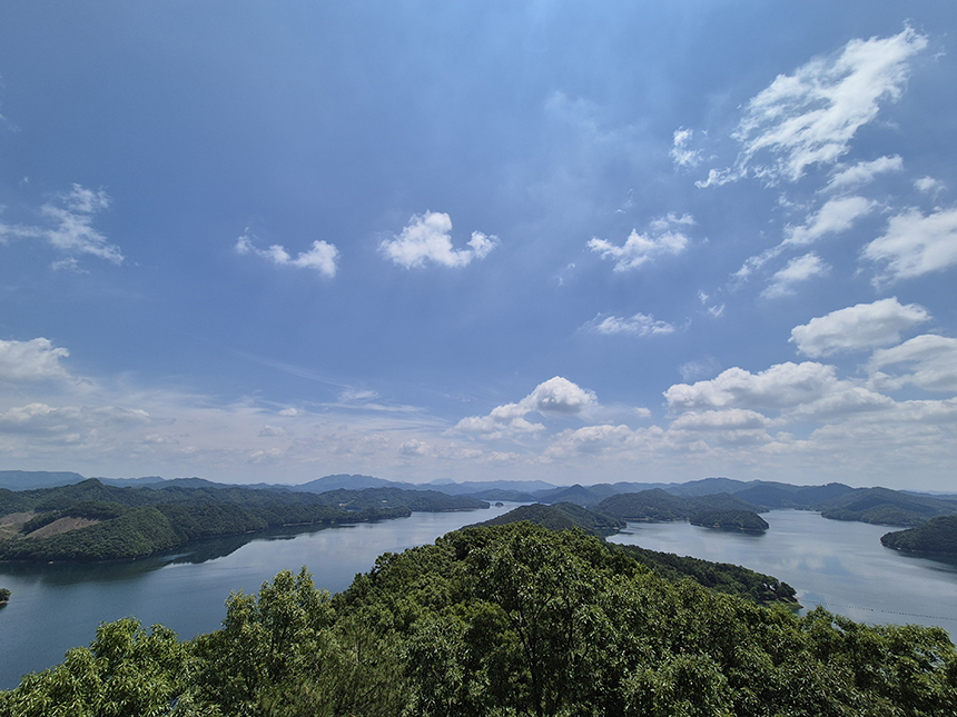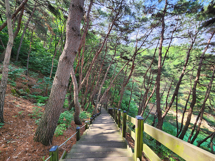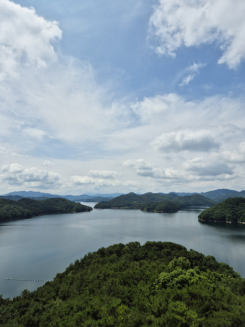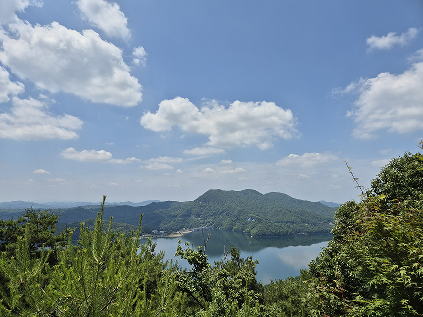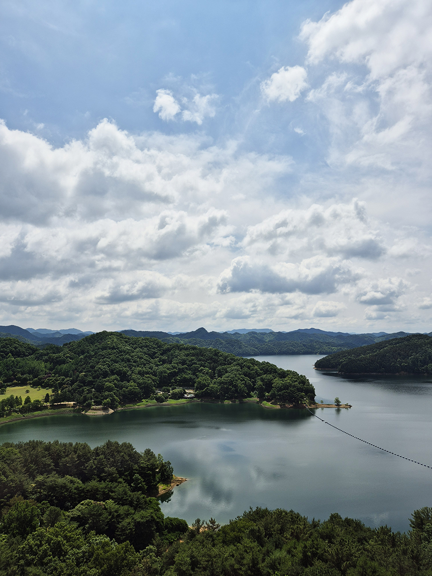 숲 속 능선길 도중에 골짜기를 넘어 연결해 놓은 출렁다리를 지나 제1전망대에 도착했어요. 봉황탑에서 보았던 것처럼 내륙의 다도해라 불리는 대청호의 푸른 녹음 물결이 시원하게 탁 트여 펼쳐집니다.