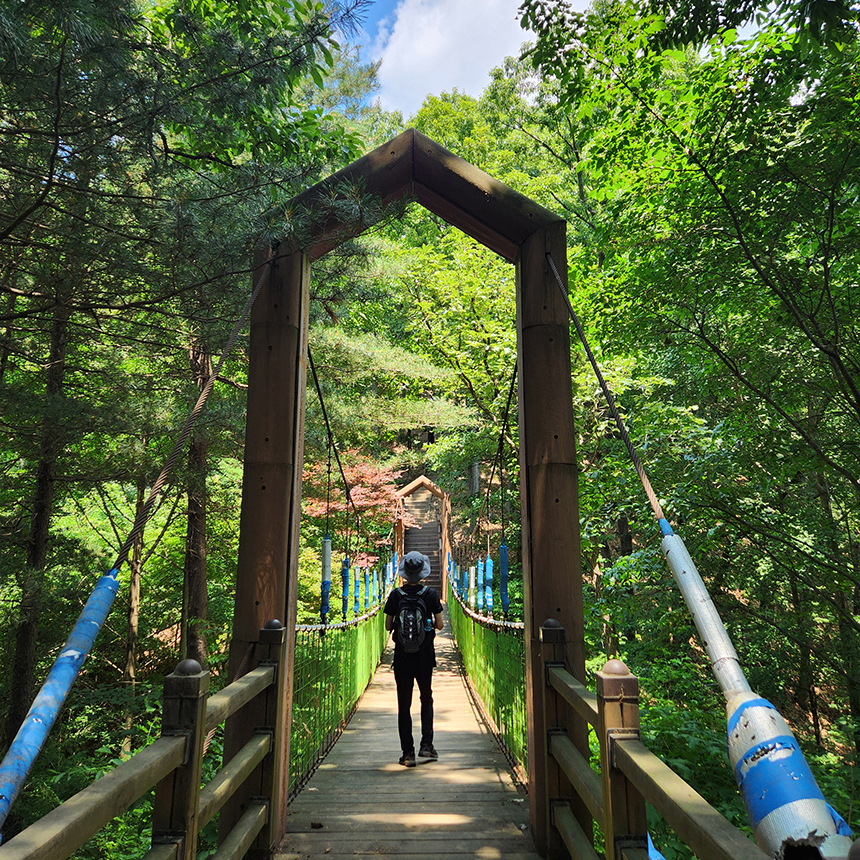 통일의 길(2.5km)과 등산로(1.4km)는 초가정에서 시작하여 청남대를 둘러싸고 있는 산 능선을 따라 출렁다리와 1, 2 전망대를 지나는 등산 트레킹 코스입니다. 등산이긴 하지만 그리 높지 않아 어렵지 않게 걸을 수 있어요~