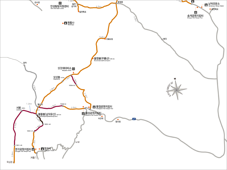 안성탐방지원센터~칠연삼거리~동엽령구간은 편도 4.5km 구간으로 약 2시간 정도가 소요되는 중급자 코스로 대부분이 완만한 경사로 이루어져 있습니다. 동엽령 ~ 중봉 구간은 경사도가 비교적 완만한 보통코스로 탐방 도중 조릿대가 많은 구간을 통과하는 코스입니다.