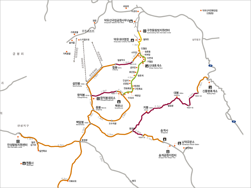 - 탐방코스 : 안성탐방지원센터 → 동엽령 → 중봉 → 향적봉 → 설천봉