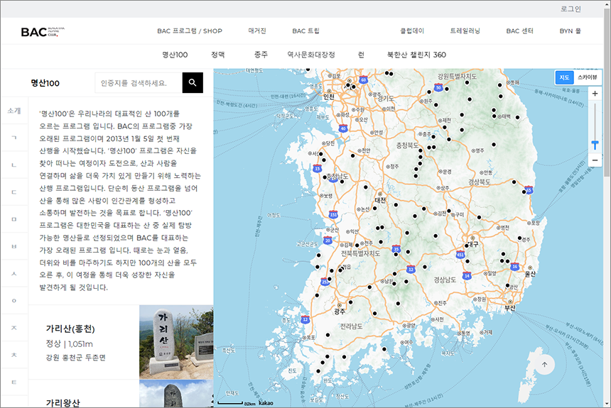 '명산100'은 우리나라의 대표적인 산 100개를 오르는 프로그램 입니다. BAC의 프로그램중 가장 오래된 프로그램이며 2013년 1월 5일 첫 번째 산행을 시작했습니다. ‘명산100’ 프로그램은 자신을 찾아 떠나는 여정이자 도전으로, 산과 사람을 연결하며 ...