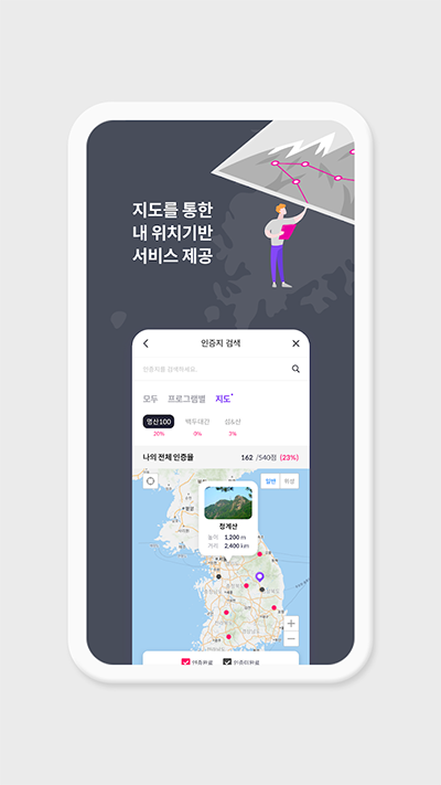 - 발도장 찍기 : 정상석 주변 반경 약 100m 이내에서 앱을 실행한 후 앱 하단의 인증 메뉴에서 해당 산을 선택하고 [GPS 인증]을 먼저 완료합니다.