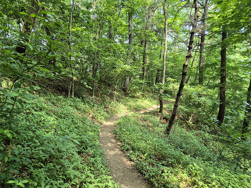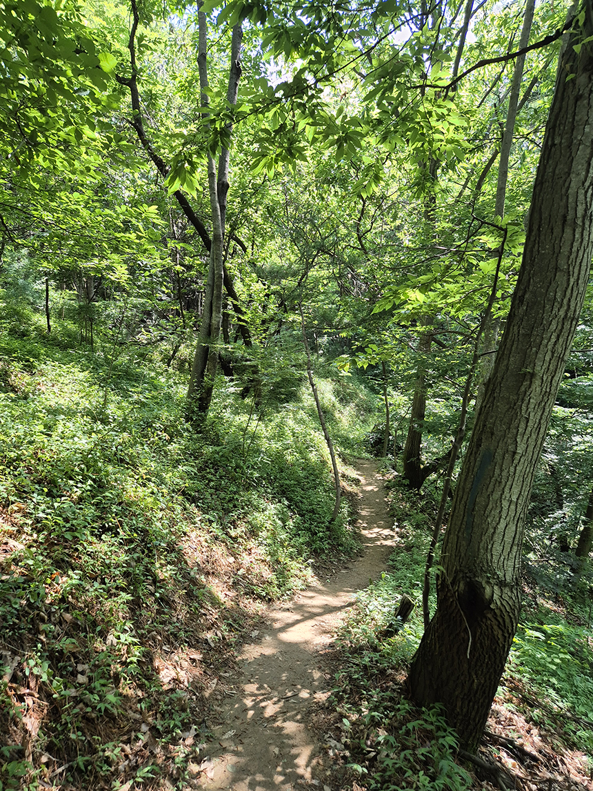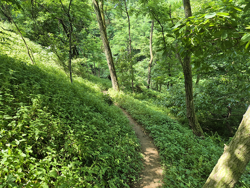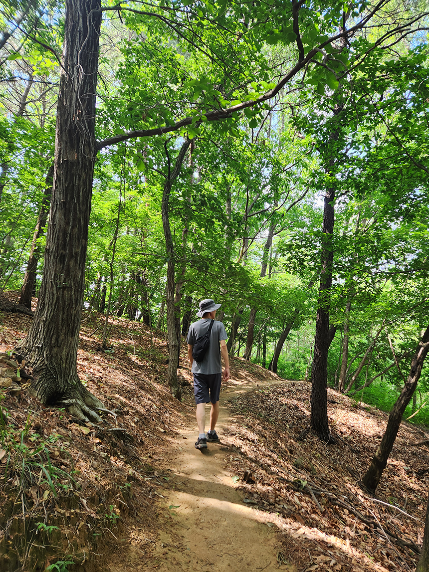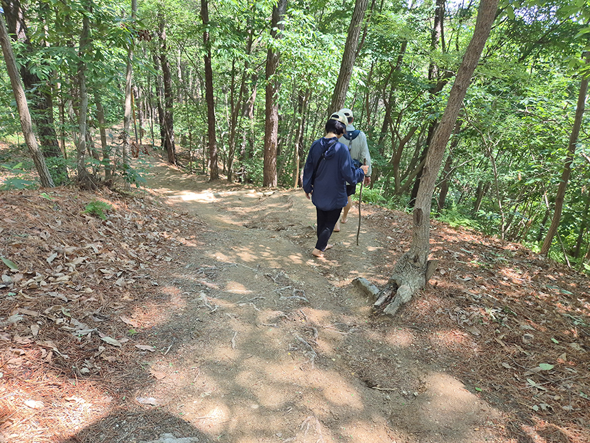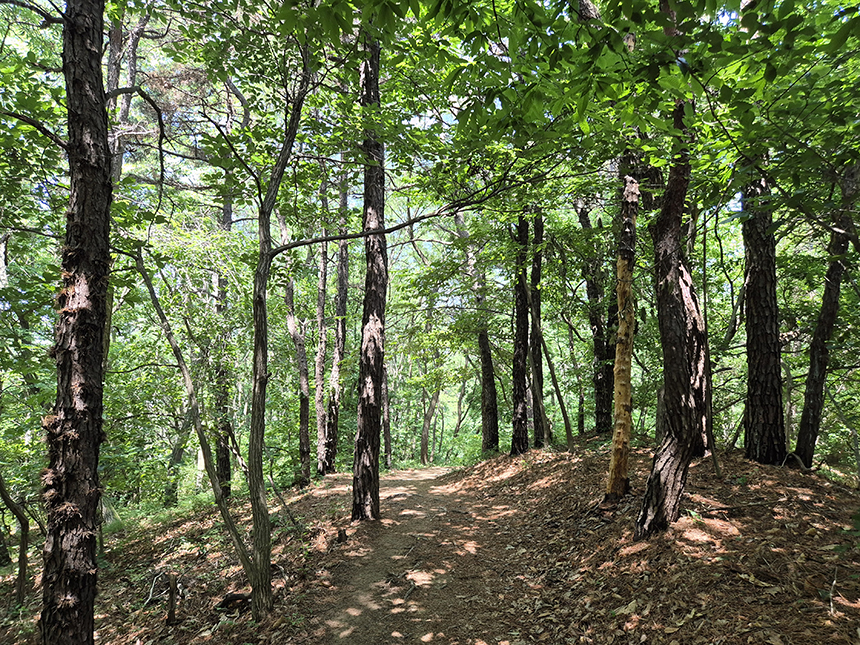 소나무, 밤나무, 참나무, 아카시아 등 자연림 그대로 숲이 우거긴 산길 위엔 그늘이 반쯤 드리워지고 산길은 완만한 편이어서 걷기가 좋네요.