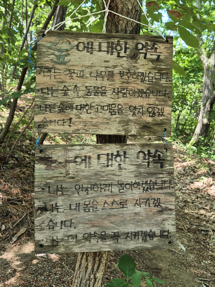"꽃과 나무를 보호하고 숲 속 동물을 사랑하고 숲의 고마움을 잊지 않겠다"는 숲에 대한 약속의 글인데요. 무심코 지날 수 있지만 꼭 지켜야 할 글이니 한 번쯤 읽어보시면 좋을 것 같아요.