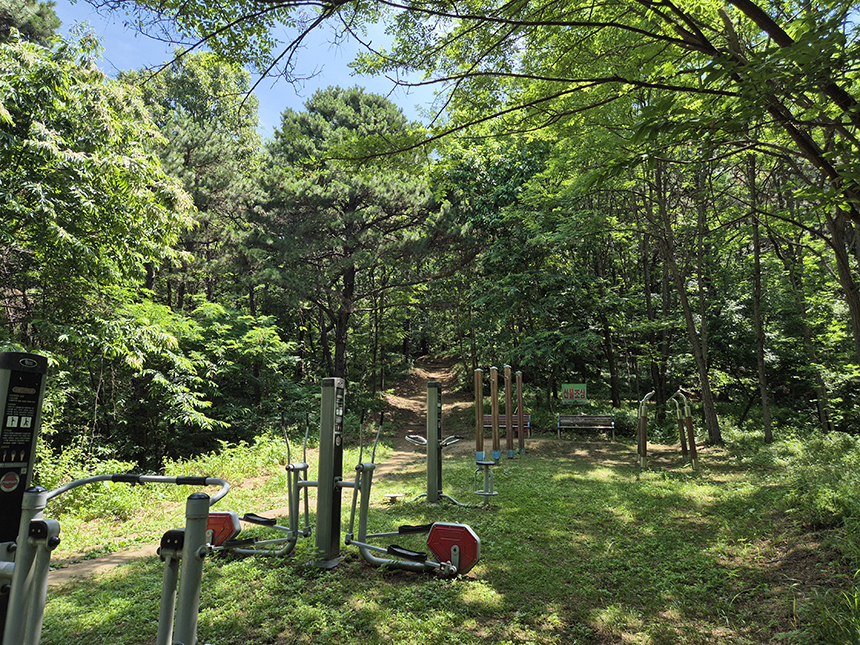 운동기구를 지나며 넓은 길을 따라 앞으로 쭈욱 올라가면 정상으로 바로 갈 수 있어요. 둘레길은 좌우(양팔 벌리듯)로 이어지는 오솔길을 따라가며 어느 방향으로 가도 다시 이곳으로 되돌아올 수 있고 오늘은 오른쪽 방향(반시계 방향)으로 진행합니다.