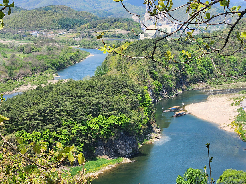 둔주봉 정상(384m)에 오르기 전, 전망대(275m)에서 보이는 한반도 지형으로 굽이굽이 흐르는 금강 줄기가 만들어 낸 절경입니다. 이 지형의 길이는 실제 한반도를 1/980로 축소한 1.45㎞로 동·서(좌우)가 바뀐 모습이지만 전망대에 설치된 거울에 비춰보면 한반도와 닮은 모양입니다.