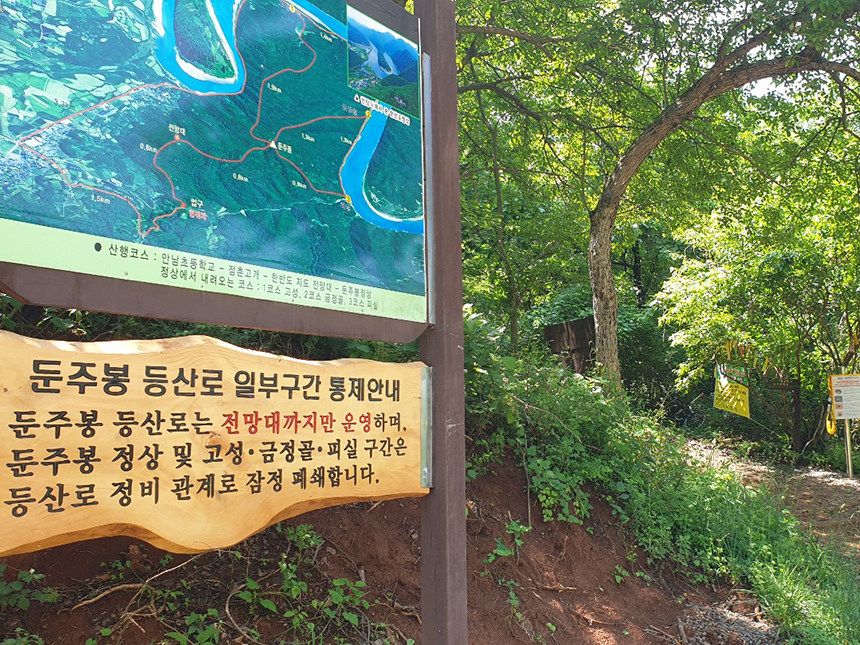 - 한반도 모양: 둔주봉 정상에서 바라보면 자연적으로 한반도의 윤곽을 닮은 지형이 형성되어 있음.