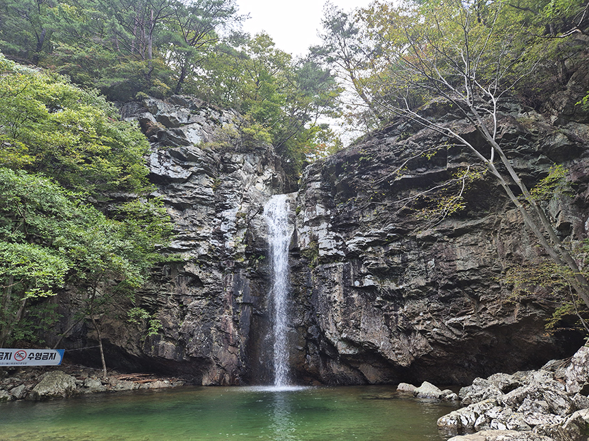 숲을 빠져나와 신불산 자연휴양림 계곡을 흐르는 파래소 폭포에 도착했어요. 시원하게 쏟아지는 폭포수를 그냥 지나칠 순 없겠죠? 너무 맑고 투명하게 비치는 폭포에 손도 담가보고 주변 바위에서 숨도 돌리고 땀도 식혀봅니다.