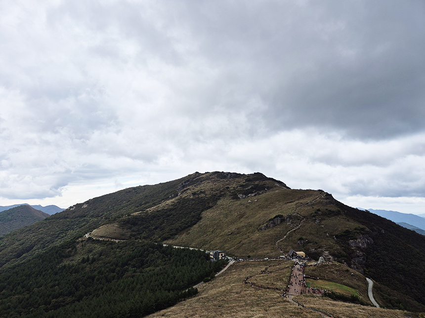 신불산 방향에서 본 간월재 풍경입니다. 산 능선을 따라 내려온 좁은 길이 간월산에서 내려오는 등산로이며 왼쪽은 배내 고개(사슴농장)로 인한 임도길이에요. 많은 분들이 등산보다는 저 임도길을 따라 편하게 오시더라고요.