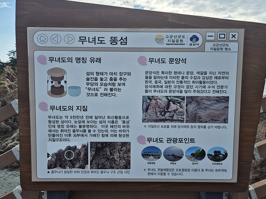 - 주요 코스 : 무녀도 조망주차장 > 무녀 1구 > 무녀도초등학교 > 갯벌체험장, 제방도로 > 무녀도똥섬 > 복귀